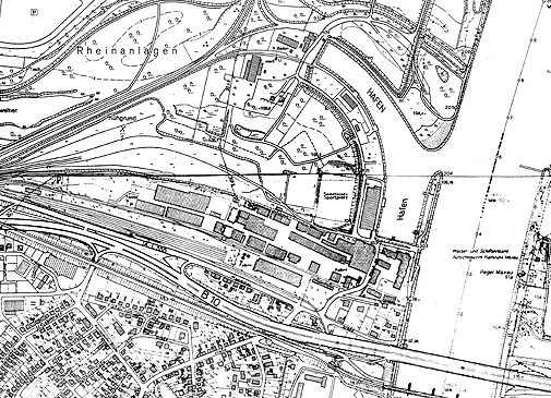 die hauptachse der neuen bebauung soll senkrecht zum rhein und parallel zur rheinbrücke entstehen. der alte backsteinerne kopfbau, der erhalten werden soll, gibt die lage und breite des geplanten gewerbebandes, dass sich nach westen erstreckt, vor. die form des gewerbebandes wird durch klare kanten, wald im norden und kanal im süden, definiert. der alte kopfbau gibt desweiteren eine zweite achse vor, die parallel zum rhein verläuft. diese freizeitachse wird geprägt durch einen fuß- und radweg, der als brücke über das hafenbecken führt und somit das ufer der gegenüberliegenden hafenseite mit einbezieht.