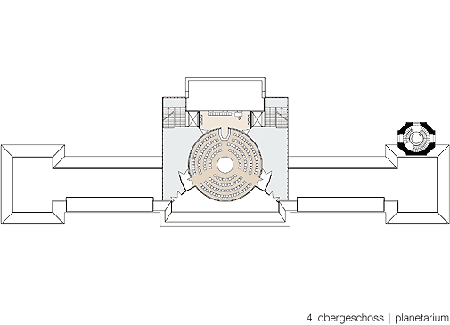 zugang zu allen nutzungsbereichen erfolgt über ein gemeinsames foyer. hier befinden sich kasse, garderobe und ein laden für bücher und astronomische geräte. für die besucher der bildungsstätte und gäste ist ein café vorgesehen. alle funktionsbereiche sollen so konzipiert werden, dass sie als einheit erfahren werden können. ebenso soll es jedoch möglich sein, die einzelnen bereiche unabhängig voneinander zu nutzen, so dass zum beispiel der zutritt zum planetarium oder zur sternwarte nachts möglich ist, ohne den museumsbereich zu öffnen.