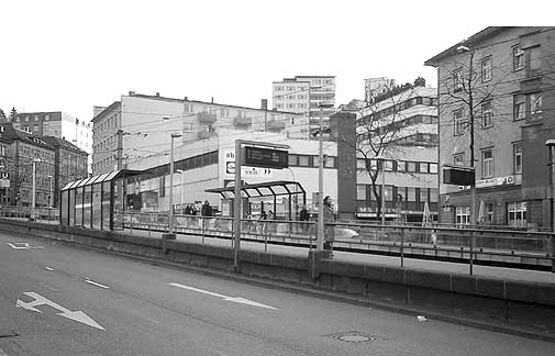 der bestand mit einem schlecker-drogeriemarkt, lidl, sowie büroräumen, wohnungen und einem parkhaus löst diese probleme kaum. die ecksituation zur charlottenstrasse ist völlig unbefriedigend. gerade da, wo das gebäude höhe braucht, schiebt es sich nur zweigeschossig richtung charlottenstrasse, eine kreuzung an der vier- bis siebengeschossige häuser die regel sind. auch was die erschliessung betrifft, kann die alte bebaung nicht überzeugen. mit seinen drei parkebenen verstopft es den kompletten bereich zwischen alexander- und blumenstrasse. die wichtige weiterführung der rosenstrasse als fussläufige verbindung zur innenstadt ist bis jetzt nur über eine dunkle hofeinfahrt zwischen schlecker und lidl und eine enge treppe möglich. die beziehung zwischen der obersten (offenen) parkebene und dem darüber sitzenden wohnhaus scheint mehr als zweifelhaft. hier hätte man durch die entfernung zur vollgestopften charlottenstrasse die möglichkeit, eine angenehmere wohnsituation zu schaffen; doch das einzige was sich dem auge hier bietet, ist ein tristes und kahles parkdeck.
